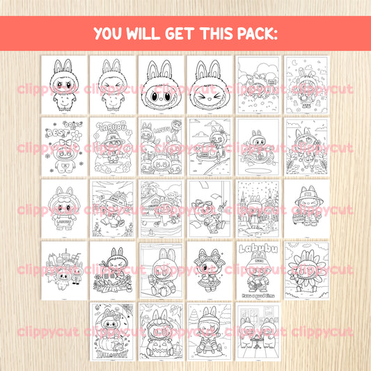 Labubu Coloring Pages for Kids - 28 Printable Labubu Sheets - Fun Activity Book PDF - Kawaii Labubu Coloring